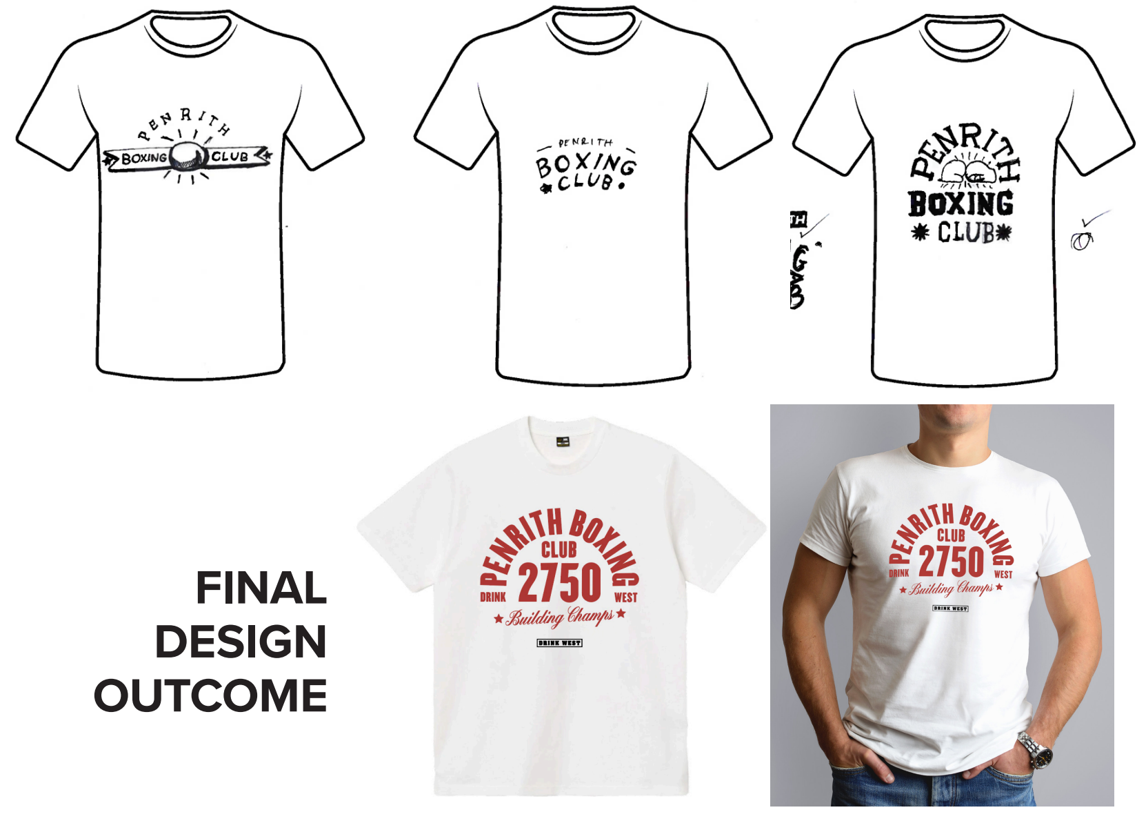 For this project, as part of my placement at Q Agency. I had to design a logo/t-shirt graphic for a fighting club in Penrith, made to be placed on t-shirts as a part of Drinkwest’s merchandise line. After printing out an outline of a t-shirt, I drew an array of concepts and possible design ideas as to what the shirt could look like, with a vintage style in mind.